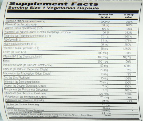 Product Description One Daily Multiple is iron-and iodine-free, and includes 27 vitamins and minerals in this convenient daily capsulesule free of all common allergies. 0