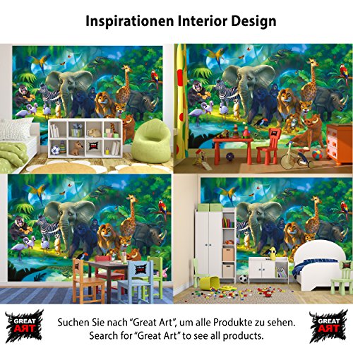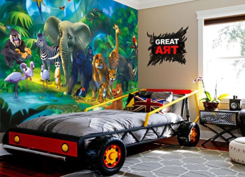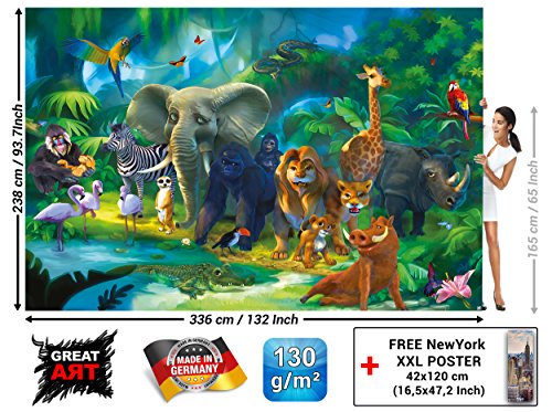 -. Binding : Toy -. Brand : Great Art -. Color : Mix -. EAN : 4260388440508 -. Feature : ✅132.3 Inch x 93.7 Inch (336 cm x 238 cm) - 8 pieces ✔ Kid's Room Adventure wall mural for your interior decoration ✔ Pure jungle feeling - as a wallpaper / ✅The animals of the virgin forest: elephant tiger lion monkey crocodile giraffe gorilla zebra toucan parrot rhino - all in one sweep ✔ An absolute highlight for your wall / ✅Wall decoration ✔ Many mounting options, e.g. as multipart picture or poster - We recommend professional attachment with glue on the wall. The XXL motive consists of 8 parts! Instruction to be found inside the packet / ✅Made in Germany ✔ Quality by GREAT ART better living designs ideal for living room, bedroom, kitchen or the kids room. / ✅★Free package content★ You will recieve a free XXL poster of the New York skyline (120cm x 42cm) in P.R.Ime quality, finished with UV varnish . Ideal as a gift or decoration! -. IsAdultProduct : 0 -. IsAutographed : 0 -. Label : GREAT ART -. Manufacturer : GREAT ART -. Model : SYNCHKG067519 -. MPN : Great Art -. PackageQuantity : 1 -. PartNumber : Great Art -. ProductGroup : Toy -. ProductTypeName : TOYS_AND_GAMES -. Publisher : GREAT ART -. Studio : GREAT ART -. Title : Jungle animals photo wall paper – safari mural – XXL jungle wall decoration children room 132.3 Inch x 93.7 Inch