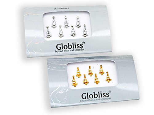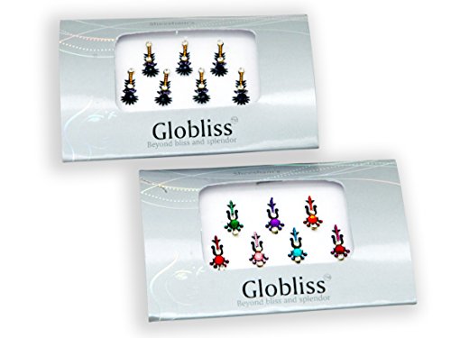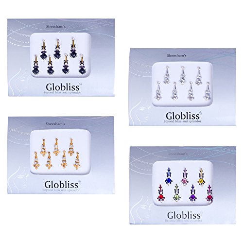 - • 4 Packs Combo Hollywood & Bollywood Standard long bindis comes with Silver,Gold ,Black and colorful crystal body gems.Get creative! Our designs are meant to be mixed and matched.Each Premium Pack Bindis are Hand packed Carefully. Only premium quality Crystals used.