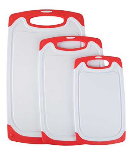 - DEEP JUICE GROOVE: Each cutting board comes with a groove on one side for collecting juices from fruits, vegetables, fish, and meats and a flat surface on the other side giving you more cutting room.