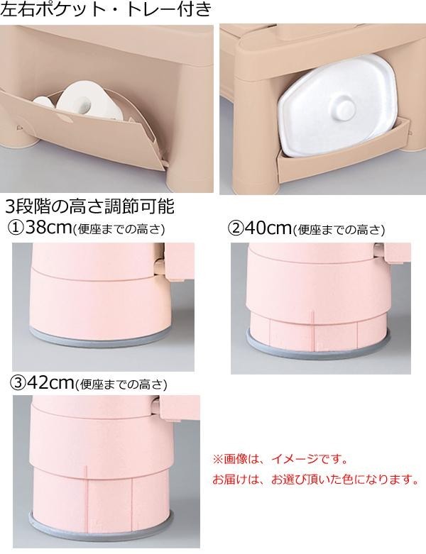 身長や症状に合わせて3段階調節でき、着脱できるひじ掛け付きです。又便座は静かに閉まるオイルタンバー式で、サイドにはトイレットペーパーなどが入るポケット付きです。 |