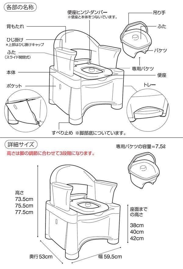 | 3段階の高さに調節可能なポータブルトイレ。 |