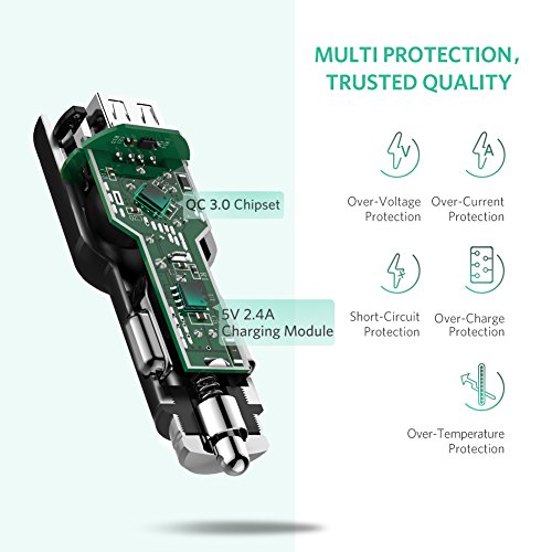 -. Feature : QUICK CHARGE QC 3.0 4X FASTER: The Quick Charge QC3.0 USB port charges 4X faster than standard chargers with Max 3A current output, compatible with Quick Charge 3.0 / 2.0 devices and non Quick Charge devices such as Samsung Galaxy S9/S8/S8 Plus/S7/S6/Note 8/NOTE 5, iPhone X/8/8 Plus/7, iPad, Google Pixel/XL/Nexus 6, LG V20/V30/G6/G5/, HTC U11/10, OnePlus 3/2, Moto Sony Huawei etc. / ISMART 2.4A Fast CHARGE FOR IPHONES: The iSmart 2.4 A USB port also offers a fast charging speed for your iPhone iPad or other none Quick Charge devices.It takes a full charge for iPhone 8/7/6 within 1.5 hours while normal charging needs 2.4 hours / SIMUTANIOUSLY CHARGING 2 DEVICES: Dual USB ports car charger supports to charge 2 devices simutaniously on your trip, allows you arrive at destination with fully charged phones and tablets;(Samsung Galaxy s8: 1.5 hours; iPhone 8 plus: 2 hours; iPad mini: 3 hours) / GOOD LOCKING RING AND LED INDICATOR: Good locking ring, fits car sockets perfectly, preventing the charger from falling out of the sock, Premium metal unibody design with LED light indicates the charging status for your device; / MULTIPLE SAFETY PROTECTION & 18 MONTHS WARRANTY: Charging with safety protection, built in with intelligence chipset for overcurrent, overheating, overloading protections; UGREEN offers 18 months worry-free warranty;