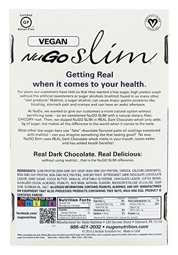 Studio : NuGo Nutrition Publisher : NuGo Nutrition Binding : Health and Beauty Product Description Getting Real when it comes to your health. For years customers have told NuGo that they wanted a low sugar, high protein snack without the artificial sweeteners or sugar alcohols (maltitol) found in so many other "diet products." Maltitol, a sugar alcohol, can cause major gastric problems like bloating, stomach pain and cramps and can have an awful aftertaste. At NuGo, we wanted to give our customers a more natural option without sacrificing taste - so we sweetened NuGo Slim with a natural dietary fiber, Chicory Root. Then, we dipped NuGo Slim in Real Dark Chocolate which only adds 3g of sugar, but makes all the difference in the world when it comes to the taste. Most other low sugar bars use 'fake' chocolate flavored palm oil coatings sweetened with maltitol - can you imagine something like that tasting good? No way. NuGo Slim uses REAL Dark Chocolate which melts in your mouth, tastes better and has added health benefits! Real Dark Chocolate. Real Delicious.without using maltitol...that is the NuGo Slim difference. 0