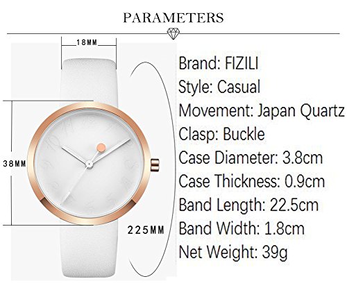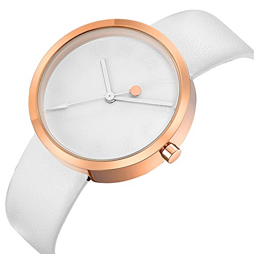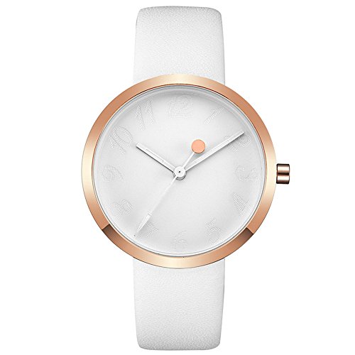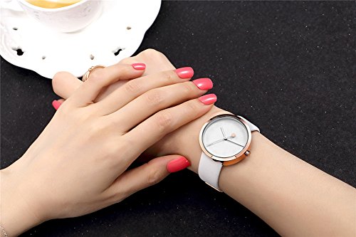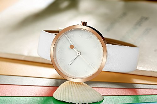 -. Feature : MINIMALISM DESIGN -- Rose gold case with white dial make this women watch a high consistency of minimalisms / QUALITY CONTROLS -- Imported Japan movement supports stable and accurate timing, soft leather band gives fatanstic wearable experiences. / ENGRAVED NUMBERAL MARKS -- Engraved big arabic numberal marks with white hands, an ideal companion for you. Elegant white leather band strap, bring you simplicity fashion. Beautiful and stylish zinc alloy case. / Waterproof for daily use. 98 FT waterproof (30 M). Perfect for all kind of business, casual, indoor activities and daily use. Hand wash, rain day, sweating, no problem! / Minimalist design make it special, best gift for business, dress, occasion, anniversary. Perfect gifts for ladies, such as wife and girlfriend ever! elegant practical and noble. Slim, confident, beautiful and shinning design, full of elegant and lively elements.