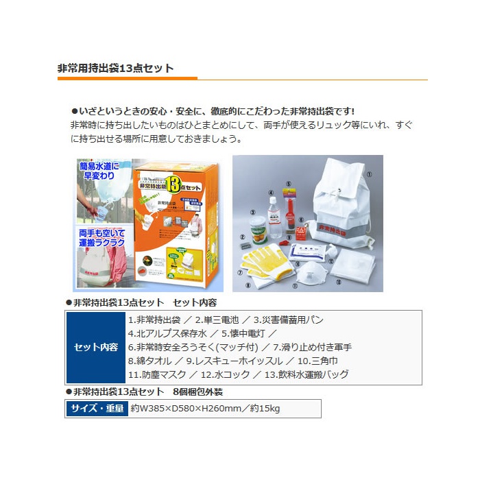 일본 방재 협회 인정 비상 반출대를 포함,비상시에 필요한 13아이템을 두 개 세트로 했습니다.