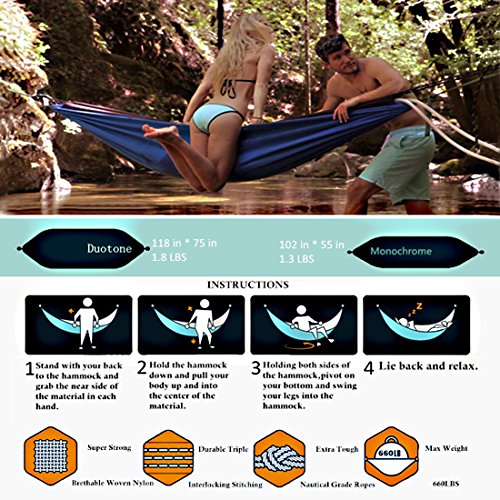 NEW UPGRADED HAMMOCK:Can be used as sunshade, camping/beach blanket, swing chair. Best hammock for family camping.A great gift for kids traveling, camping, backpacking, or just hanging it and relaxing on it in the patio