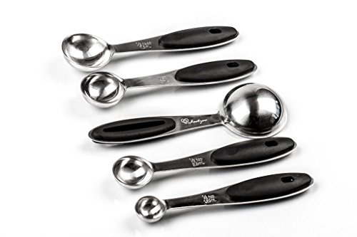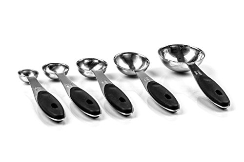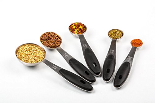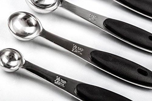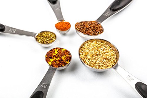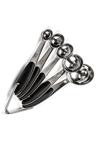 - ? HASSLE FREE KITCHEN: 5 durable & accurate stainless steel measuring spoons including 1 tbsp, 1/2 tbsp, 1 tsp, 1/2 tsp, 1/4 tsp, with permanently engraved measurement markings (metric & US) on the handle. Soft detachable silicone handles for a non-slip grip and the triangle clip organizer easily stores your spoons together.