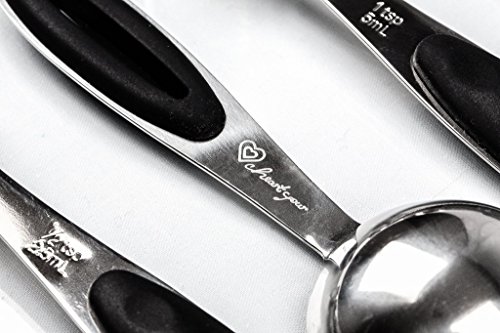 - ? WILL LAST A LIFETIME: Heart Your Kitchen Measuring Spoons are made from top quality Stainless Steel. They are resistant to finger prints, smudges and food coloring, plus they are easy and simple to clean and maintain, as they are dishwasher safe. The measuring spoons are extremely durable and resistant to dents, heat and scratches.