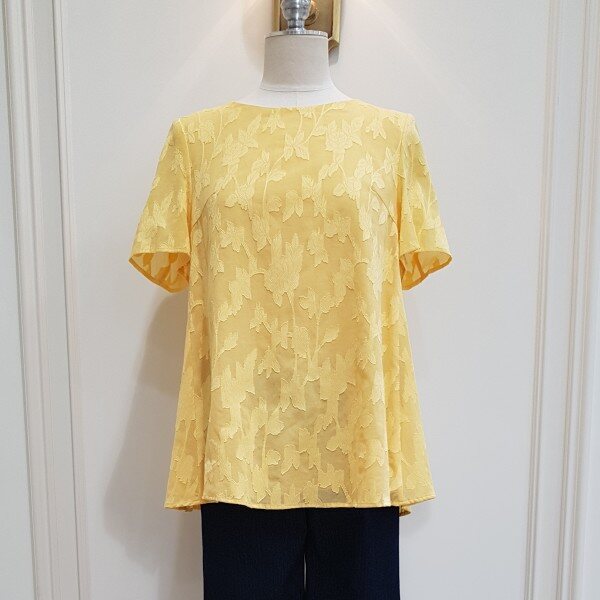 면아사 소재의 자카드가 독특한 오버형 블라우스입니다. 백 리본 디테일로 포인트를 주었습니다. 리본을 풀지않고 단추 오픈만으로도 탈의가 가능합니다