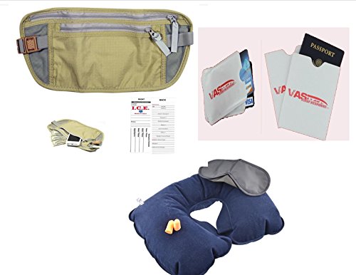 -. Brand : Readi USA -. Color : Khaki/Gray -. Department : unisex-adult -. EAN : 0611387826604 -. Feature : Soft Fabric Money Belt & Gear Pouch Keeps your important items concealed and close at hand / Washable material for easy cleaning & long-lasting use - Size: 11.5" x 5.5"; Length of strap: 29"; Color: khaki/gray, (2) Mesh pockets inside larger zippered compartment. Adjustable elastic strap with buckle closure for a secure fit / 3 Pc Comfort Set Inflatable Neck Pillow, Ear Plugs & Sleeping Mask / 3 RFID Sleeves - 2 Credit / Debit Card, and 1 Passport / Bonus: Free! Emergency Disaster Gear (EDOG) I.C.E. Card Included -. Label : Readi USA -. Manufacturer : Readi USA -. PackageQuantity : 1 -. ProductGroup : Apparel -. ProductTypeName : LAGE -. Publisher : Readi USA -. Studio : Readi USA -. Title : SECURITY & COMFORT TRAVEL PAK 2- MONEY BELT RFID I.C.E. PILLOW MASK & EAR PLUGS -. UPC : 611387826604