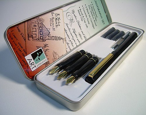 -. Feature : A great set for discovering the art of calligraphy / Features three gold plated calligraphy nibs / There are three black ink cartridges and a converter pump / With a barrel and a cap with metal clip / Everything comes in a nice silvertone tin box