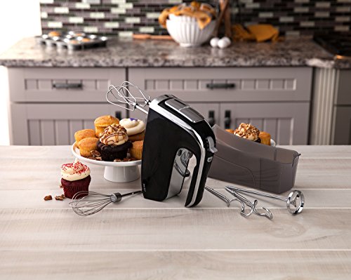 6 Speed Hand Mixer with Pulse Product Description Mix anything from whipped cream to cookie dough, or even make a milkshake with the Hamilton Beach 6 Speed Hand Mixer with Pulse. Mixing dry ingredients with a first speed that is too fast and powerful can spread flour all over the kitchen. This hand mixer has an innovative slow-speed pulse function that gives you added control and prevents splattering. The handle is designed for a comfortable grip, and the unique Bowl Rest feature allows the mixer to sit on the edge of the bowl, eliminating messy drips. With 290 watts of peak power, this hand mixer gives you ultimate control over your mixtures, from slow-speed pulse to high-speed burst. A special QuickBurst button gives a quick boost of power and can be used for tough tasks at any speed. Six versatile attachments including twisted wire beaters, milkshake mixer, dough hooks and a whisk offer options for all your mixing needs. A convenient snap-on storage case keeps all the attachments together so you don't have to search for them each time. The storage case also keeps the cord tucked away when not in use. Features and Benefits • Snap-on storage case with easy-access door • Six speed settings • Pulse function — pulses on the slowest speed for added control and less mess • 290 watts peak power with burst button • Six attachments included - twisted wire beaters, milkshake mixer, dough hooks, and whisk • Convenient eject trigger for attachments Unique pulse feature Incorporating flour or other dry ingredients can sometimes be a mess with traditional hand mixers. The slow-speed pulse function gives you more control and prevents splattering. Just pull the speed control switch back to Pulse and slowly combine the ingredients. Then adjust to a higher speed as needed. Need a quick burst of speed? Press and hold the Burst button for additional power at any speed. Bowl Rest Setting the mixer on the counter can create messy drips. Use the Bowl Rest while adding ingredients or checking a recipe. Simply turn off the mixer and set the mixer on the edge of the bowl. The mixer is stabilized and any drips fall back into the bowl instead of onto your counter. Powerful enough for all your mixing needs Well equipped to take care of any mixing job, this hand mixer has six different speed settings. With 290 Watts of peak power you will have ultimate control over mixtures, from slow-speed pulse to high-speed burst. The following mixing guide offers suggestions for selecting the correct mixing speed. Begin on speed 1 or Pulse and increase to desired speed depending on the recipe. Speed Function P PULSE feature for better control when incorporating ingredients and prevents splattering O OFF (Must be OFF/O to eject beaters) 1 LOW speed for folding or mixing in dry ingredients, muffins, or quick breads 2 To cream butter and sugar; most cookie dough 3 MEDIUM speed for most packaged cake mixes 4 Frosting and mashed potatoes; kneading dough 5 Beating egg whites; kneading dough 6 HIGH speed for whipping cream Cookie dough mixing tips • Use a large mixing bowl so that the ingredients spread out for easier mixing. • Butter or margarine should be at room temperature. • Add flour one cup at a time, mixing thoroughly after each addition. • Chips and nuts should be stirred by hand. Easy cleaning and convenient storage Once the mixer is turned off and unplugged, pull the squeeze trigger to eject the beaters. All of the attachments are dishwasher safe or can be hand washed in warm soapy water. Storage is very easy, too. No more searching through drawers for misplaced beaters, the mixer and all attachments can be kept in one place. All six attachments as well as the cord fit in the convenient snap-on storage case. Recipe Creamy Peanut Butter Pie Ingredients: • 1 cup butter • 1 cup packed brown sugar • 1 cup peanut butter • 1 container (12 oz.) frozen whipped topping, thawed • 9-inch graham cracker crust Directions: 1. In a medium saucepan, combine butter and brown sugar. Cook over medium heat until butter is melted and mixture is smooth; stir frequently. Refrigerate 10 minutes. 2. In large bowl, beat peanut butter and brown sugar mixture at LOW speed until blended. Increase speed and beat 1 minute at HIGH speed. Reduce speed to LOW and add whipped topping; beat one additional minute. 3. Pour into graham crust and refrigerate for several hours before serving. Serves: 8Feature