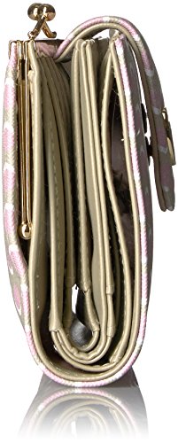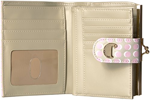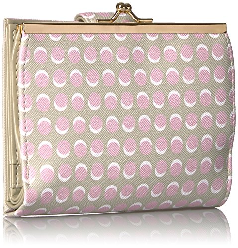 Custom Printed Faux Leather with Gold tone Logo Plaque/Hardware Dotty Dots Lexington Wallet features a 5" framed purse, double outside snap closure for expandability, 15 credit card slots, 8 storage pockets, bill compartment and I.D. window.