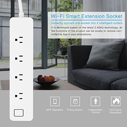 Specifications: Material: ABS + PC (750°C flame retardant) Item Color: White Outlet Quantity: 4 Total Power: 2000W 10A (each outlet support Max 10A current) Input: AC 100-240V, 50/60Hz Communication: Wi-Fi Wireless Frequency: 2.4GHz Wireless IEEE Standards: WiFi 802.11b/g/n Security Type: WEP64/WEP128/TKIP/CCMP(AES) Security Regime: WEP/WPA-PSK/WPA2-PSK OS Supported: Android 4.2 or above, iOS 8.0 or above Working Temp.: -10~45°C Working Humidity: =80% Quality Certification: FCC Power Cable Length: Approx. 1.45m / 4.7ft Size: 26*6*2.6cm / 10.2*2.4*1" (L*W*H) Net Weight: 0.465kg / 16.4oz