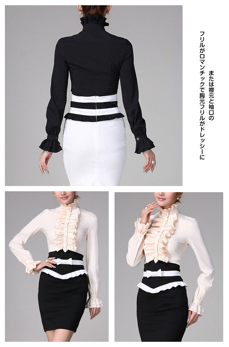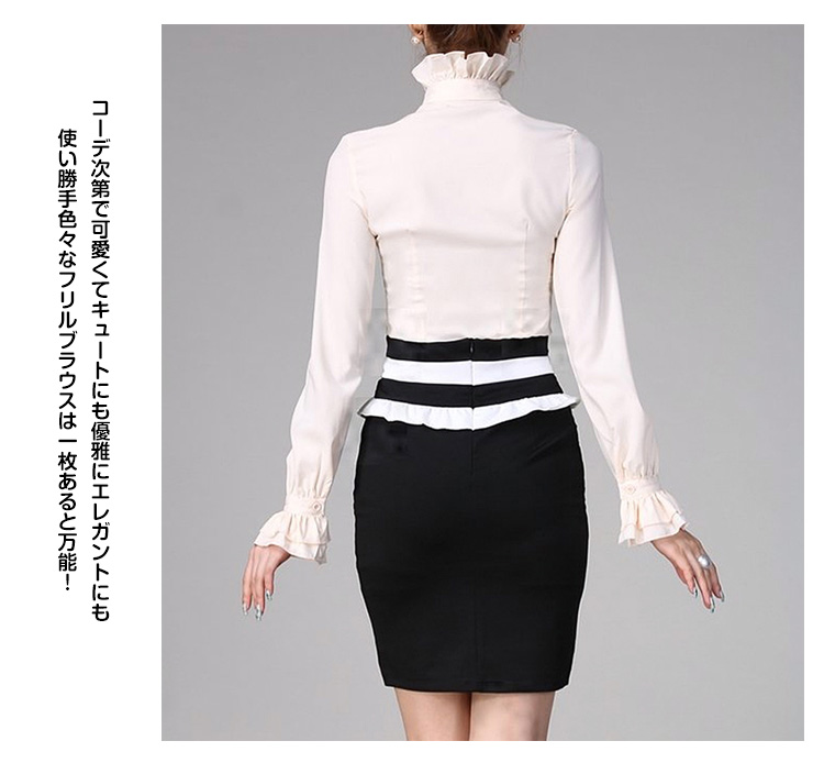 | 立体感のあるフリル長袖ブラウス登場!フォーマルな場所でも着れるおしゃれなデザインです。後姿もすっきりと360度どこから見ても綺麗。襟が少し高めになってフリルばかりが目立つ間違いなしまたは襟元と袖口のフリルがロマンチックで胸元フリルがドレッシーにコーデ次第で可愛くてキュートにも優雅にエレガントにも使い勝手色々なフリルブラウスは一枚あると万能! | |