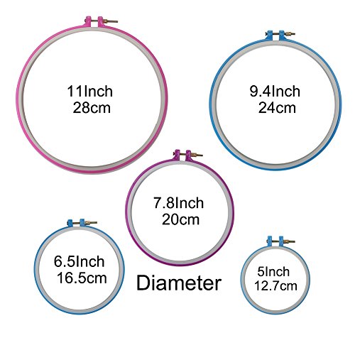 - MULTIPLE SIZES - Comes with 5 hoops in random color. Embroidery hoops sizes range (inner hoop diameter): from 5inch/12.7cm, 6.5inch/16.5cm 7.8inch/20cm, 9.4inch/24cm to 11inch/28cm