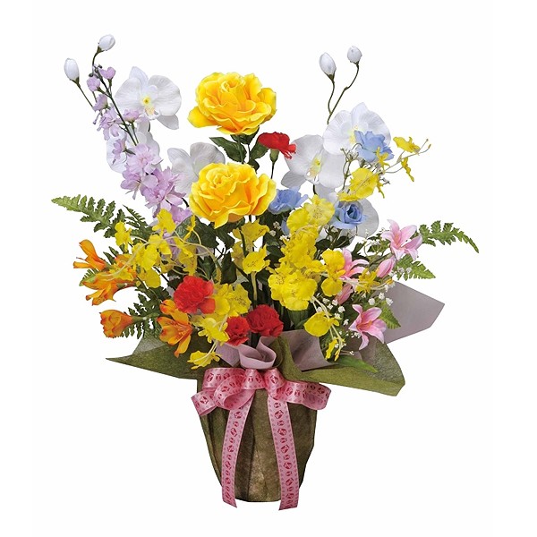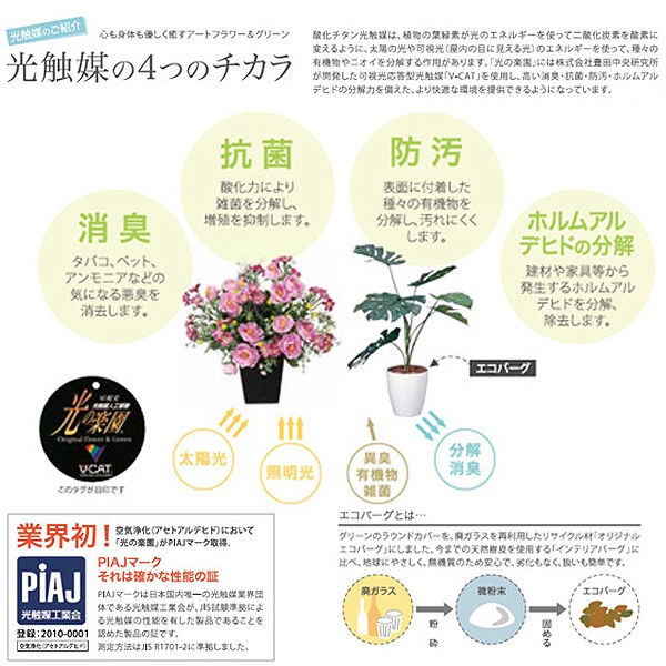 お手入れ不要!置くだけでお部屋の空気や見えない菌を浄化する光触媒フラワーアレンジ豪華開運8色アレンジ!人に優しく喜ばれるフラワーギフト!お部屋や廊下のアクセントとして、またオフィスやお店ののエントランスにおススメしたい「人工植物・光触媒フラワーアレンジ」です。 まるで本物様な豪華気品あふれる元気あふれるアレンジ。アップで見せたくなるほどのクォリティーです。胡蝶蘭やバラ、色とりどりな開運8色を取りそろえた華やか洋花アレンジ。新築祝いや開店祝い、節目のお祝いなど開運を祈願して贈りたい。アップで見せたくなるほどのクォリティーです。太陽や光のエネルギーで種々の有機物や臭いを分解する効果のある「光触媒。可視光応答型光触媒「V-CAT」を使用した高い消臭・抗菌・防汚・ホルムアルデヒドの分解力を備えたより快適な環境をご提供いたします。水やり、剪定などお手入れも不要。ただそこに置くだけで、お部屋を華やかな空間にイメージアップ!目にも癒され、さらに空気も浄化する一石二鳥な観葉植物です。新築祝い、記念日のお祝い等各種の記念のご贈答にぜひお勧めしたい商品です。