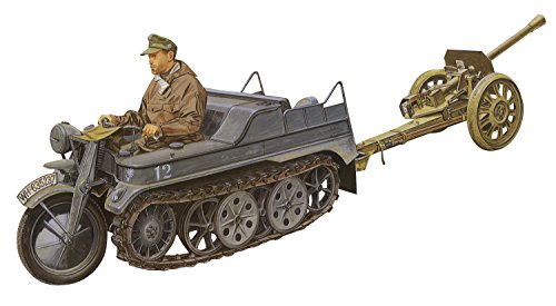 履帯とタイヤを組み合わせたハーフトラックなど、半装軌車輛は各国でさまざまに作られました。ドイツ軍も第二次大戦で部隊の機動力を高めるために多数の車両を開発していますが、その中でもっとも小型の車両として知られているのがケッテンクラートです。小型装軌式オートバイという正式名称が示すように、オートバイに履帯を組み合わせた車両です。前輪はオートバイのハンドルと同じ形式で履帯をぢょう側に装着した車体は後部に兵士二人が座ることのできるシートを備えていました。エンジンは約1500ccの水冷直列4気筒を搭載。人員はもちろん、リヤにカートを装着して各種資材の運搬や小型の家宝の牽引などにも幅広く使用されたのです。 ユニークな形状の装軌式オートバイ、ケッテンクラートを1/35スケールで再現したプラスチックモデル組み立てキットです。 特色ある車体形状は左右ボディは別パーツで再現するなど、細かな部品分割で複雑な形を再現しています。千鳥配置の転輪やサスペン ションアーム、プラスチックの連結式履帯パーツなどが凝縮した密度感ある仕上がりを演出。 運転席もオートバイをイメージさせるシートや計器パネルなども雰囲気十分。仕上がり全長約85mmの小型モデルですが、存在感 あふれるキットです。 このモデルではさらに、リヤに牽引する野砲もセット。モデル化されたのはプップヒェンと呼ばれた8.8cmロケット発射機です。砲口の 先端が広がった形状にシンプルな形状の砲架なども再現しています。 特徴あるスタイルが人気のケッテンクラートだけに、各種情景などでも幅広く活躍するキットです。Feature