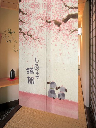 Noren Japanese Doorway Curtain 85x150cm Happy Dogs Cherry Blossom