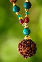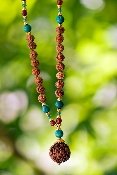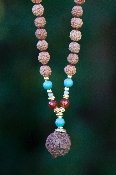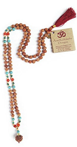 Our Amrita Mala contains Turquoise Magnesite (dyed), a purification stone, working with the throat chakra, bringing clarity to communication. Carnelian (heat treated) protects from all negativity, helps to focus the mind and aids in decision making, while having a cooling affect on the body. Small beads of agate are harmonizers of body, mind and spirit, while cleansing and stabilizing the aura. Anchored with a large rudraksha bead. The Rudraksha bead is the heart of Aum Rudraksha Designs creations, bringing today's world the wisdom and power of the ancient sages in the form of contemporary malas. Adorned with rudraksha seeds, each piece is handcrafted, blessed and designed in Bali. The Rudraksha beads we use are grown on sustainable plantations in South East Asia and are authentic. The stones we use together with our rudraksha beads in malas and jewelry are highest quality and are only those that have power and healing aspects. This is a major part of what we are about. We check the vibration (power) of our beads, as many have a higher vibration than others and we use the best in our mala jewelry. The Rudraksha bead we mainly use is five mukhi representing lord Shiva. Rudraksha beads are sacred and need to be treated with respect and care. Wash them once in a while to remove dirt and dust. Oil them with coconut or sandalwood oil to preserve them. They will turn darker with your own body oil when wearing them. This is the desired effect. Take them off when you sleep.