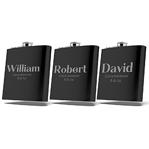-. Brand : United Craft Supplies -. Color : Black -. EAN : 0680196092531 -. Feature : FREE LASER ENGRAVING / Set of 3 - Laser Engraved 6 oz. Matte Black Flasks. / Length:3 5/8" - Height: 4 1/4" - Width: 0 7/8" / Laser Engraved in the USA / HOW TO CUSTOMIZE: Click on yellow Customize Now button and simply follow the instructions. -. ProductGroup : Kitchen -. ProductTypeName : KITCHEN -. Title : Set of 3 - Personalized Flask, Groomsmen Gift, Customized Groomsman Flasks,Wedding Favors, Matte Black -. UPC : 680196092531