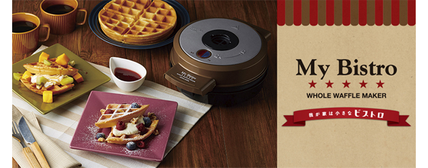 ●マイビストロ・キッチンシリーズにかわいい円型ワッフルが焼ける「ホールワッフルメーカー」が仲間入りしました。お洒落で美味しいワッフルの出来映えはもちろん、調理の過程も絵になるクッキングアイテムです