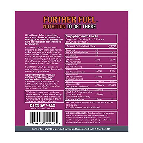 -. Title : Natural Energy Booster +Caffeine Soft Chews Sport Nutrition Boost with Vitamin B12 and Natural KSM-66 Ashwagandha. Natural Stress Relief. FURTHER FUEL 6 Convenient travel bags