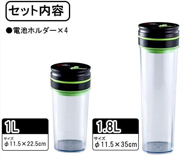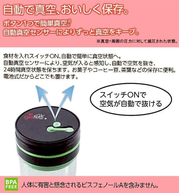 | ボタン一つで真空状態になるキャニスターのセットです。食材を入れスイッチON!!自動真空センサーにより、空気が入ると感知し自動で空気を抜きます。お菓子やコーヒー豆、茶葉などの保存に便利です♪電池式だからどこでも置けます。 |