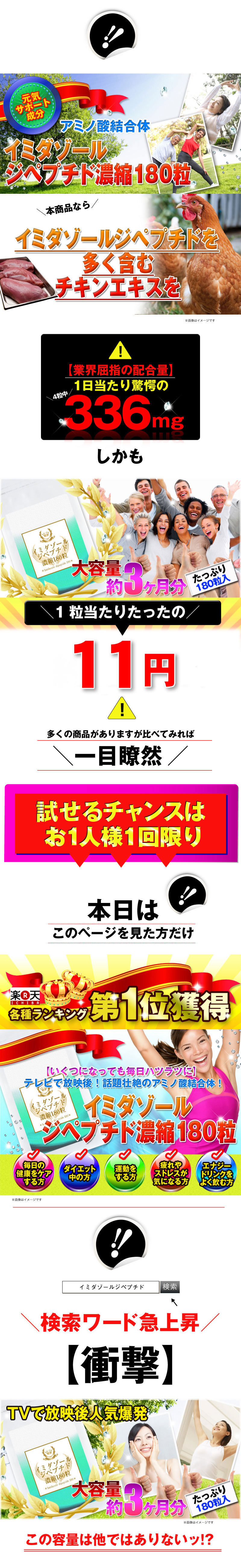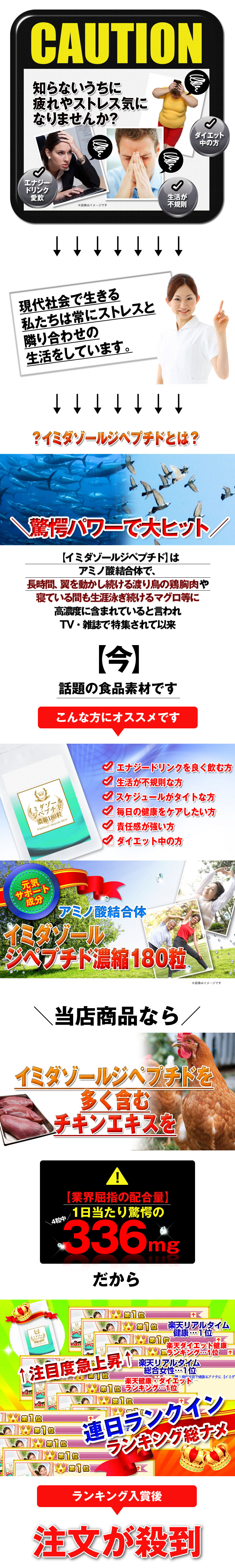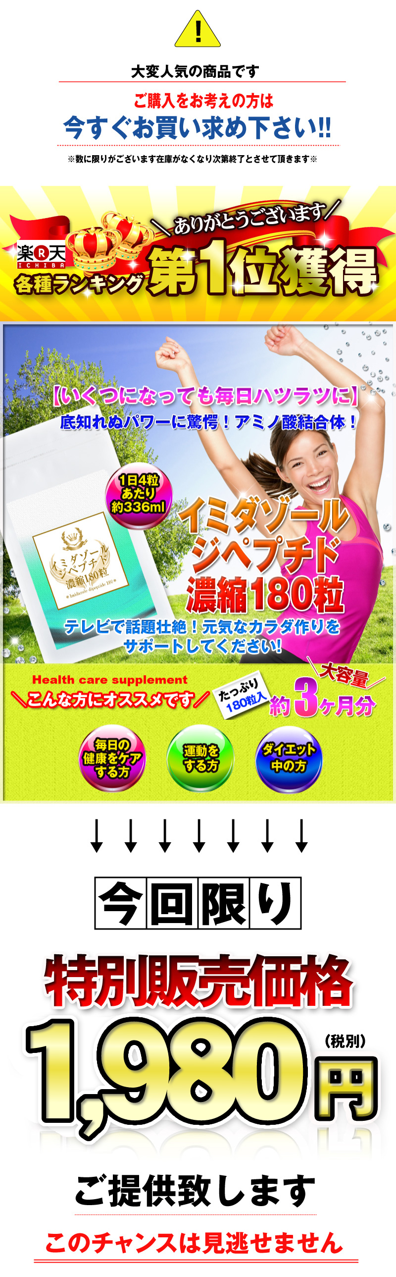 比べてみれば一目瞭然! !業界屈指の配合量! ~~~~~~~~~~~~~~~~~~~~~~~~~~ イミダゾールジペプチドを含むチキンエキスを 1日あたり驚愕の \\336mg// ≪4粒中≫ しかも大容量 180粒★3ヵ月分! このボリュームは 他では ≪あり得ないッ!?≫ テレビで放送されてから検索ワード急上昇中の≪元気成分≫! 運動量が多い渡り鳥や回遊魚のパワーに驚愕!!? アミノ酸結合体『イミダゾールジペプチド』は長時間、翼を動かし続ける渡り鳥の鶏胸肉に高濃度に含まれていると言われ、今注目の食品素材なんです。 何千キロも飛ぶと言われる渡り鳥や寝ている間も生涯泳ぎ続けるマグロ等…TVで特集をされ只今大ヒット中 毎日の健康の為にもオススメなんです! 当店のイミダゾールジペプチド180は 【ココがすごい!!】 イミダゾ―ルジペプチド配合エキスを 1日336mgも 贅沢に♪ この≪336mg≫は 業界屈指の配合量! 是非、他の商品と見比べてみてください♪ しかも大容量《180粒・3ヶ月分》 1粒11円! 【こんな方にお勧め】 ▼▼▼ ◆エナジードリンクをよく飲む方 ◆生活が不規則な方 ◆スケジュールがタイトな方 ◆毎日の健康をケアしたい方 ◆責任感が強い方 ◆ダイエット中の方 |