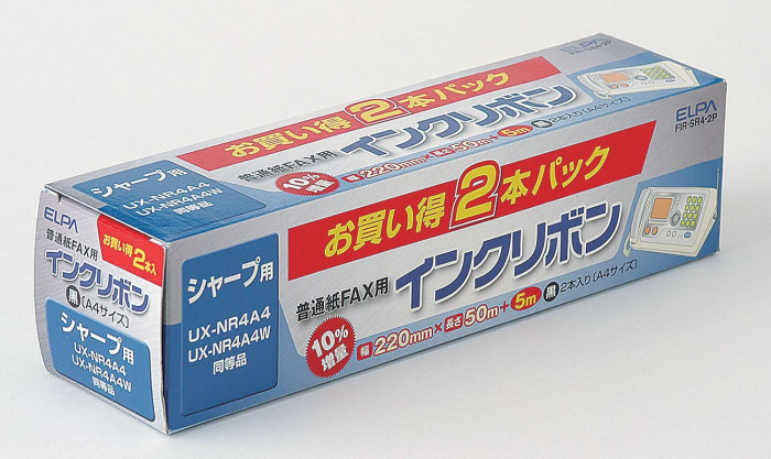 シャープ、NTT対応サイズW22.0×D5.3×H3.35cm個装サイズ:6×6×22.8cm重量382g個装重量:418g素材・材質PP仕様A4サイズ、リボン1本プリント枚数:約185枚、幅220mm×長さ50m+5m、2本入り付属品取扱説明書製造国マレーシア お買い得2本パック!FAXインクリボン ------ ココがポイント! ------ ●適合機種 シャープ:UX-NR4A4/UX-NR4A4W ●NTT:ファクシミリ用P形A4インクリボン(5) ※対応機種にご注意下さい シャープ、NTT対応