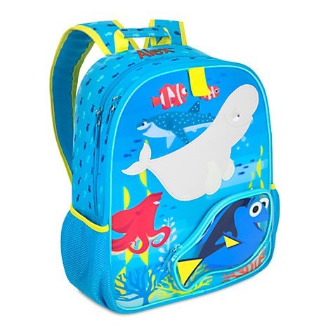 -. Feature : Disney Store kids backpack featuring Dory, Hank, Bailey, Nemo, Marlin, and Destiny / Exterior Dory-shaped compartment with zip closure / Zip main compartment with two fabric pulls / Padded back and adjustable shoulder straps / For ages 3+; Dimensions 16'' H x 12'' W x 5'' D