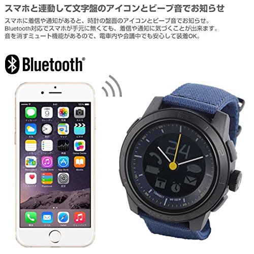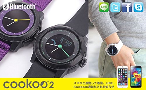 -. Feature : [ブランド]Cookoo 【サイズ】フェイス:直径4.2×厚さ約1.5cm 全長:26cm 【重さ】シリコンベルトモデル:約75g ナイロンベルトモデル:約65g / [素材]プラスチックケース、アクリルガラス、ステンレス、 ナイロン、シリコン 【ムーブメント】日本製3針式ムーブメント デジタル表示のデュアルタイム表記 【防水機能】10気圧防水 / [Bluetooth]Bluetooth Smart(Bluetooth 4.0) 【電池】デジタル部分:CR2032コイン電池 アナログムーブメント用:SR621SWコイン電池 【電池寿命】Bluetooth:約1年間 時計:約3年間 / [機能]・電話着信通知 ・メール着信通知 ・スマホ電池残量通知 ・カレンダー通知 ・テキストメッセージ着信通知 ・SNSメッセージ着信通知 ・カメラリモートシャッター機能 ・Drop pin機能 ・check-in機能 ・ミュージックプレーヤー操作 ・アラーム&タイマー機能 ・置き忘れ防止機能 ※アプリのアップデートで様々な機能を追加予定となります。 / [対応機種]【iOS8.1 デバイス】 iPhone6,6plus,5S,5C,5,4s/ iPad mini/ iPad(第3~4世代)/ iPod touch(第5世代) 【android 4.3デバイスまたはandroid 4.4機器】 GalaxyS3/S4/S4mini GalaxyS4 Active/ Note 2/3 HTC One/Nexus 5など ※複数のデバイスが、近い将来追加される予定です。詳しくはアプリのページをご覧ください。 【保証期間】お買い上げ日より1年間