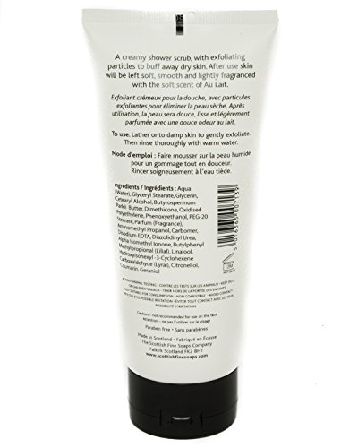 - A creamy shower scrub, with exfoliating particles to buff away dry skin. After use skin will be left soft, smooth and lifhtly fragranced with the soft scent of Au lait.