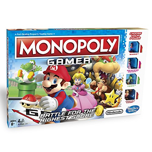 Studio : Game Publisher : Game Binding : Toy Product Description It's the Monopoly board game with a Nintendo twist as it joins forces with beloved Nintendo characters. Instead of standard Monopoly tokens, the Monopoly Gamer edition features Super Mario characters, each with their own unique powers. Buy property, pay rent and battle for points! The game ends when Bowser has been defeated. Player with the highest score wins! Includes gameboard, 4 Super Mario Character tokens (Mario, Princess Peach, Yoshi, and Donkey Kong), 4 Character cards, 4 Reminder cards, 8 Boss cards, 16 Title Deed cards, 1 Numbered die, 1 Power-up die, 90 coins, and game guide. 0