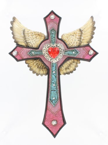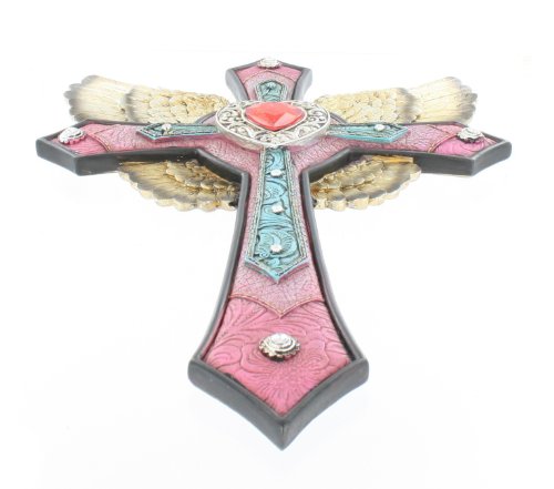 Gold Angel Wings Pink Wall Cross - Intricate Details Faux Leather and Rhinestones - Rock and Roll Angel