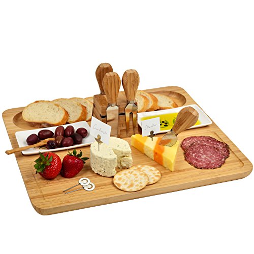 This beautiful serving tray has many unique features that make it a stand out at any party. It includes a recessed bread or cracker area at the back of the board, two removable ceramic dishes (inset in the board for stability) and a magnetic tool holder at the center, and a nicely sized front area for serving cheese or appetizers. This set has an elegant look with refined details such as tapered edges and rounded corners. The set includes (2) Small Bamboo spoons, (1) Fork, (2) Knives, (1) Spreader, (2) Ceramic dishes, and (4) Cheese Markers. The four cheese tools are stainless steel with bamboo handles. Serving tray includes an attractive milled juice groove around the front serving area. Lifetime Warranty.Feature