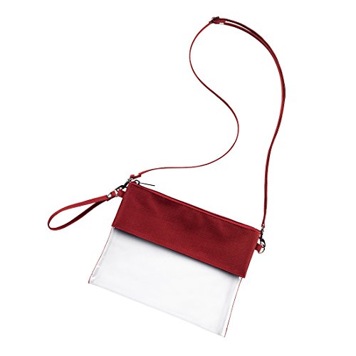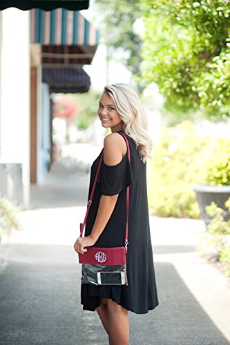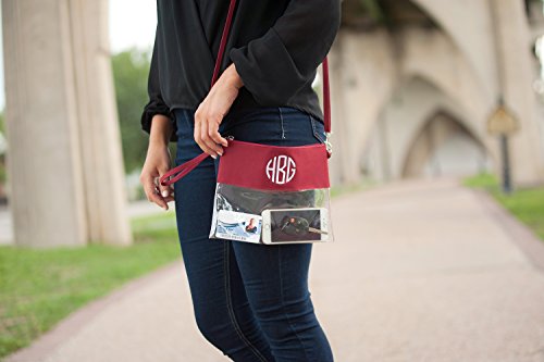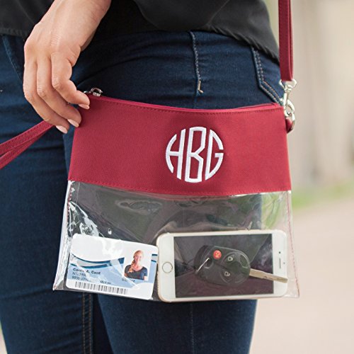 Product Description Perfect Stadium Clutch, Crossbody, or Wristlet Purse that is Stadium Friendly or can be used as a Shrink Bag for Work. 10" L X .5" W x 7.5" H Clear Plastic Body with Colored Polyester Trim and Silver Toned Accents Detachable Adjustable Crossbody Strap Wristlet Strap .375" x 11" circumference Secure your items with this Zipper Top Closure. Make it extra special by adding embroidery of your name, team name, or monogram. All sales are final on embroidered items. No refunds or exchanges. 0