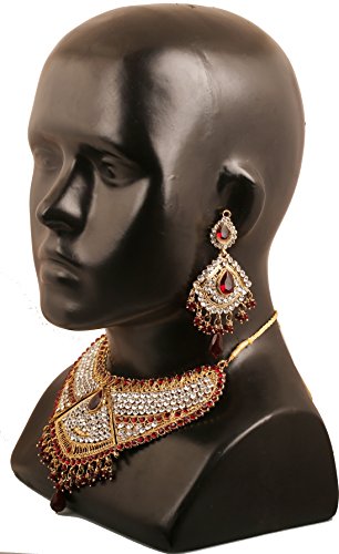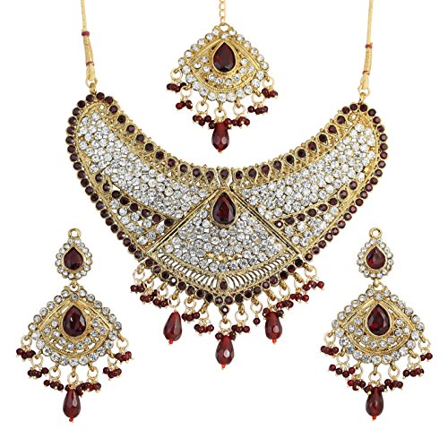 Alloy metal, gold tone very luxurious, designer and traditional Indian Kundan Polki look bridal necklace set with huge Mangtika, faux ruby drops and stones. For Perfect Matching, search for TOUCHSTONE BANGLES.