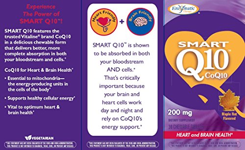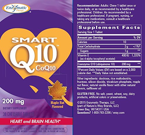 ReleaseDate : 2008-02-08 Studio : Enzymatic Therapy Publisher : Enzymatic Therapy Binding : Health and Beauty Product Description SMART Q10 200mg Maple Nut by Enzymatic Therapy Inc. 30 Chewable SMART Q10 200mg Maple Nut 30 Chewable Product SMART Q10 is shown to be absorbed in both your bloodstream AND cells. Thats critically important because your brain and heart cells work day and night and rely on CoQ10s energy support. Essential to mitochondriathe energy-producing units in the cells of the body Supports healthy cellular energy Vital to optimum heart brain health Suggested Use As a dietary supplement adults chew 1 tablet once or twice daily - Or as directed by your healthcare professional. Supplement Facts Serving Size 1 Chewable Tablet Servings Per Container 30 Amount Per Serving Daily Value Calories 10 Total Carbohydrate 2 g 1 Sugars 1 g Vitamin E (as d-alpha tocopheryl acetate) 400 IU 1 333 Coenzyme Q10 (ubiquinone 10) 200 mg Percent Daily Values are based on a 2 000 calorie diet Other Ingredients Dextrose rice maltodextrin fructose silicon dioxide tricalcium phosphate maple nut flavor natural vanilla flavo 0