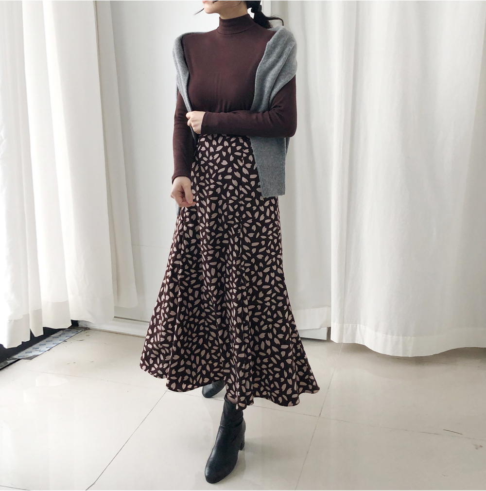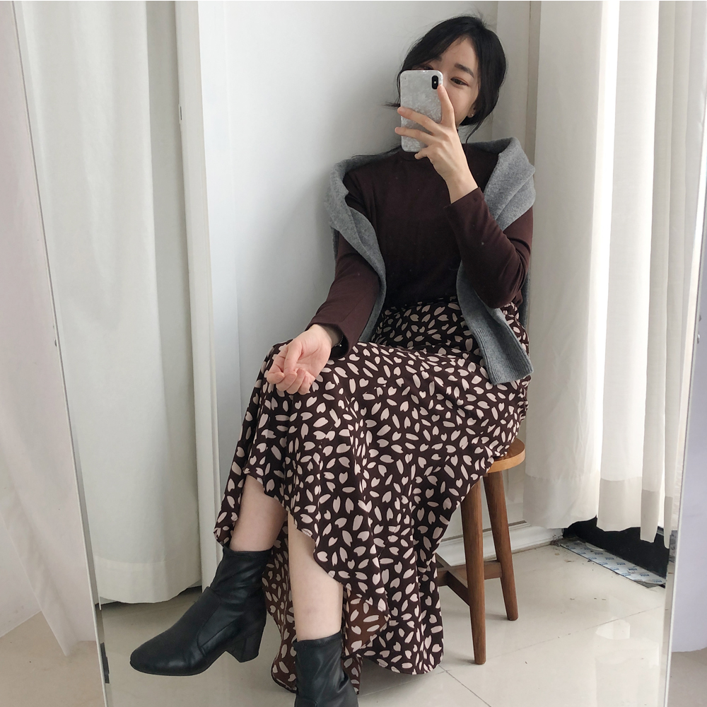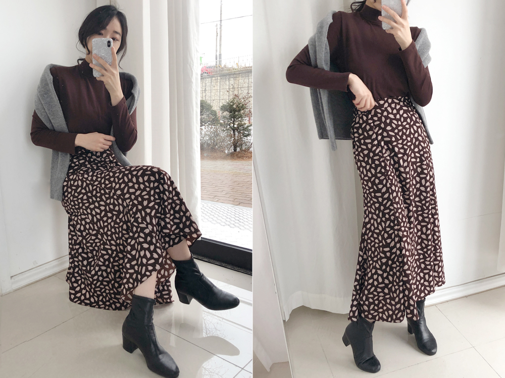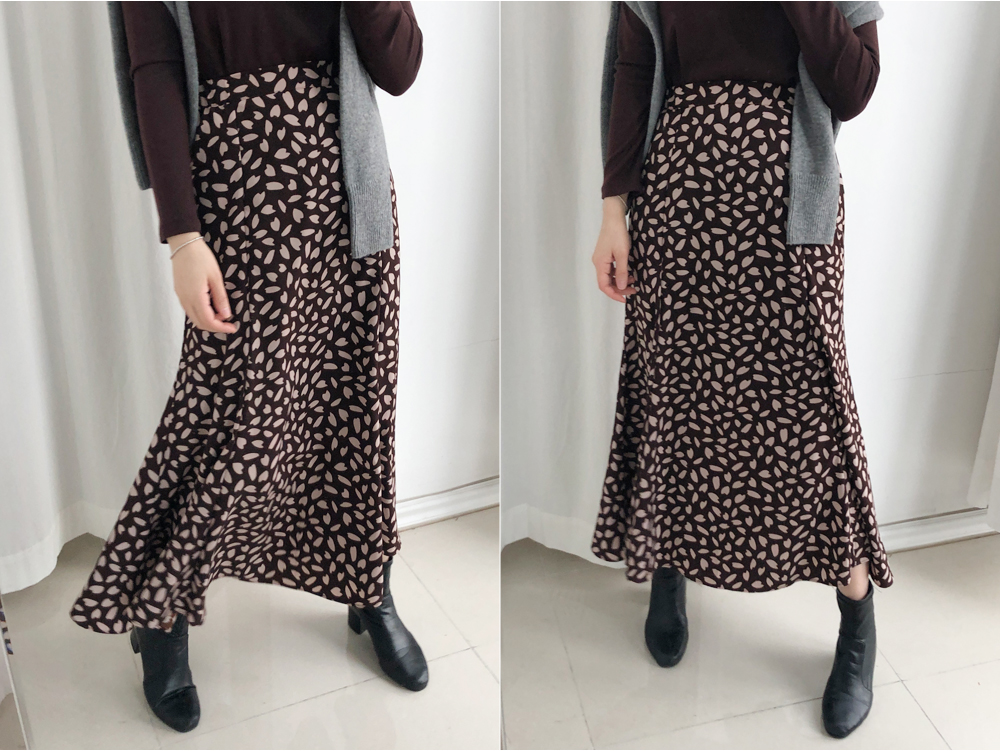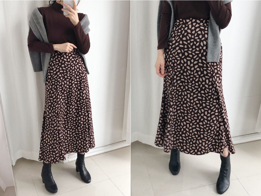 꽃잎 패턴이 매력적이 스커트는 롤한 기장감으로 레그라인은