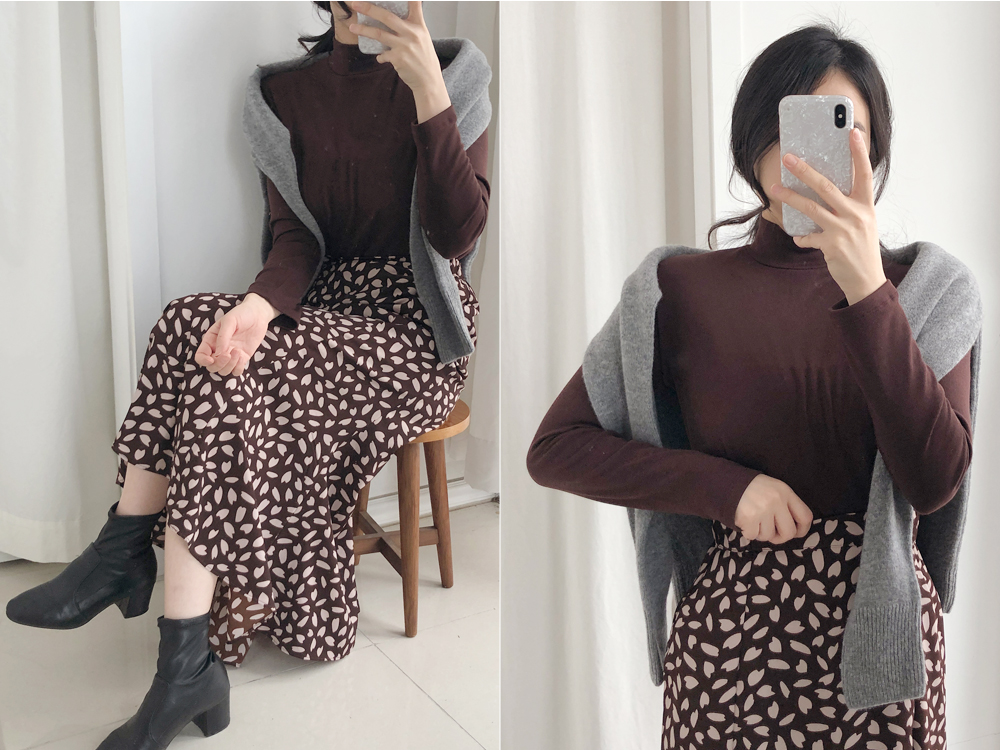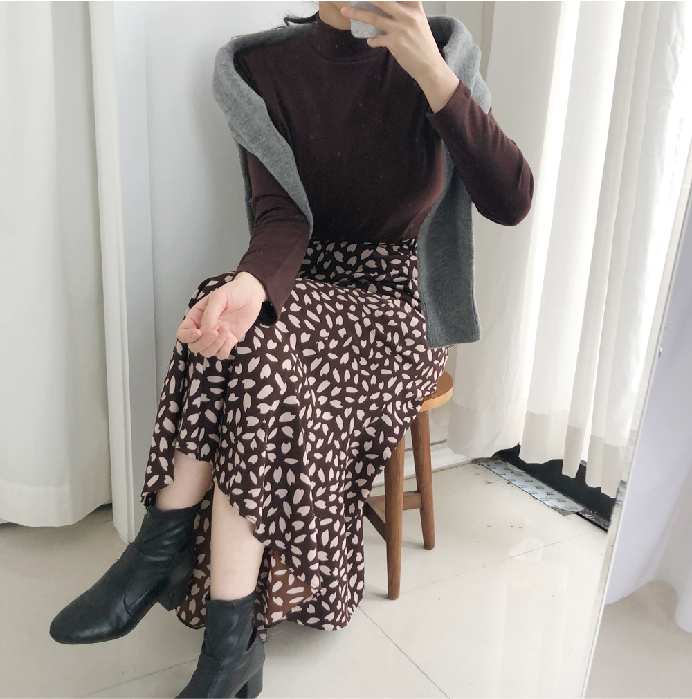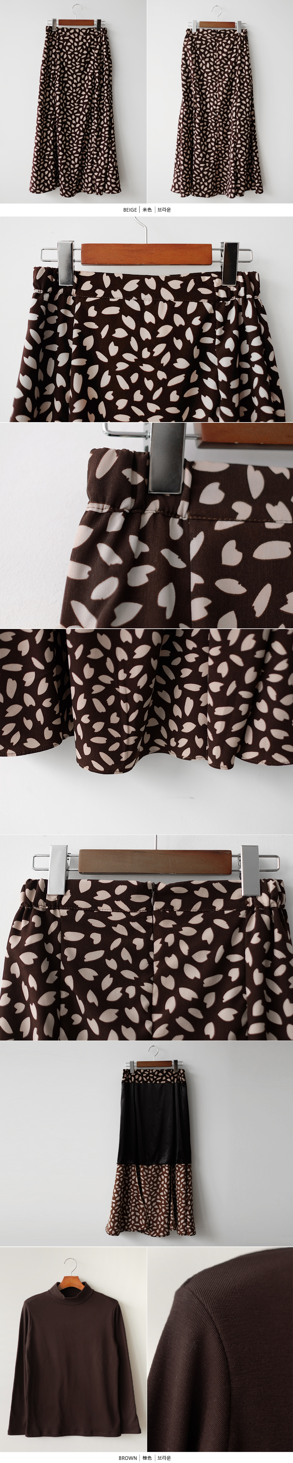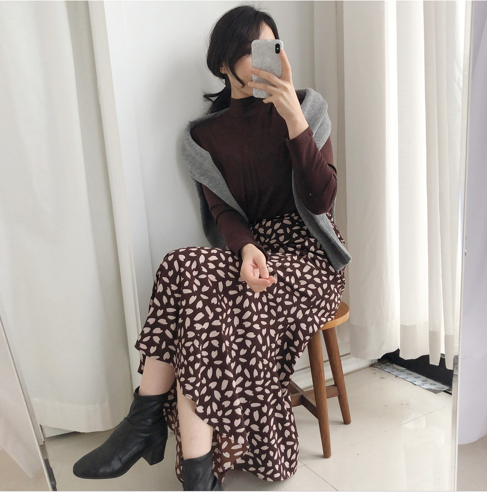 꽃잎 패턴이 매력적이 스커트는 롤한 기장감으로 레그라인은