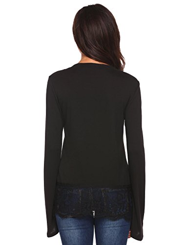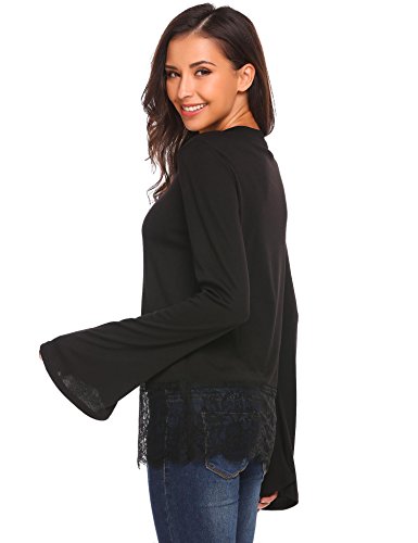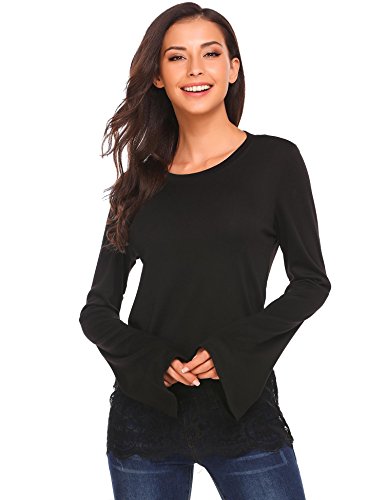 Women Casual Flare Sleeve Lace Hem Slim Fit Shirt Blouse Top