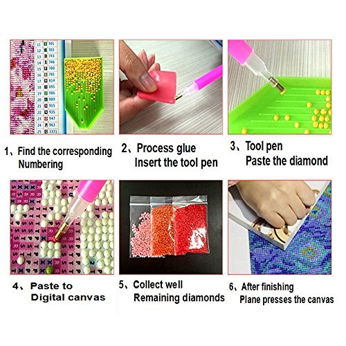- DIY PRODUCTION STEPS - Firstly place the same diamonds in tray, then take the "pen" insert to the square adhesive lightly, leave some adhesive on the pen, finally pick up the diamond and place it on the corresponding number on the canvas