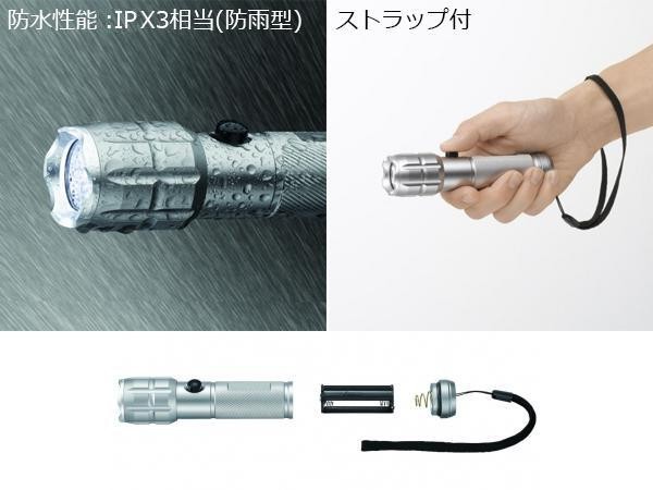 | 仕様 | 使用光源:チップタイプ白色LED(交換不可) 全光束:約150lm(最大値) 電源:単4形乾電池×3本(別売) 連続点灯時間:約5時間 防水性能:IPX3相当(防雨型) 取扱説明書(パッケージ記載) |