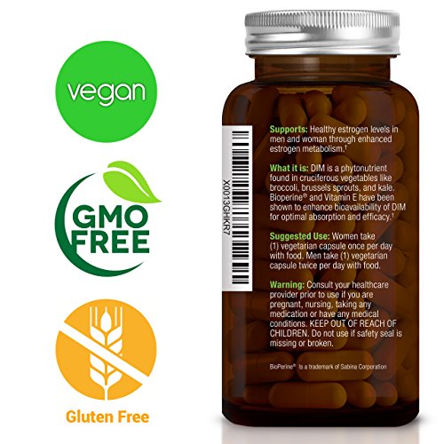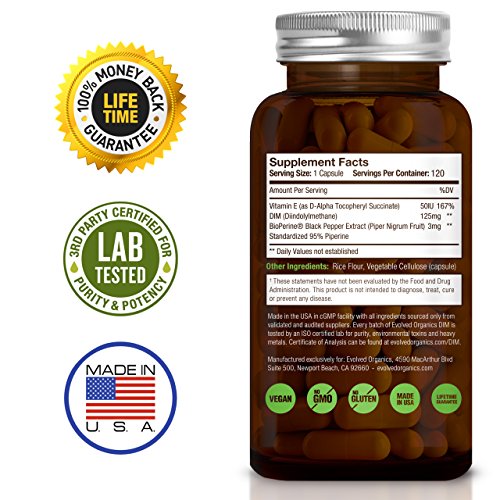 -. Feature : BENEFITS FOR MEN: DIM as an estrogen blocker can help eliminate weight gain around the stomach, increase sex drive, fight acne, healthy prostate and increase energy. DIM is also used as a supplement for bodybuilders. / BENEFITS FOR WOMEN: DIM as an estrogen blocker that can help ease your menopause symp and provide menopause relief, fight PCOS, support breast health, aid in weight loss, give you a balanced energy and fight against acne. / BIOPERINE: To ensure your body absorbs as much DIM as possible, we craft our DIM (Diindolylmethane) with 3mg Bioperine and 50IU Vitamin E resulting in needing to take only one capsule to achieve the same effect as two capsules of other brands. / COMPARE TO OTHER BRANDS: Our DIM offers 120 servings per bottle, 125mg optimum dosage, 3mg Bioperine, 50IU Vitamin E, made with a veggie capsule, free from magnesium stearate and titanium dioxide. Our DIM is also certified by an independent third party laboratory. / LIFETIME 100% MONEY BACK GUARANTEE - We're so confident that you'll love our DIM that we'll refund every penny if you don't like it! Simply contact Evolved Organics directly for a full refund. What do you have to lose?