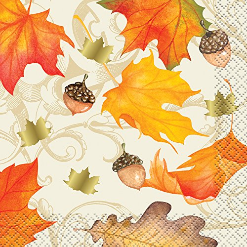 - 16 Foil Gold Fall Leaves Thanksgiving Beverage Napkins