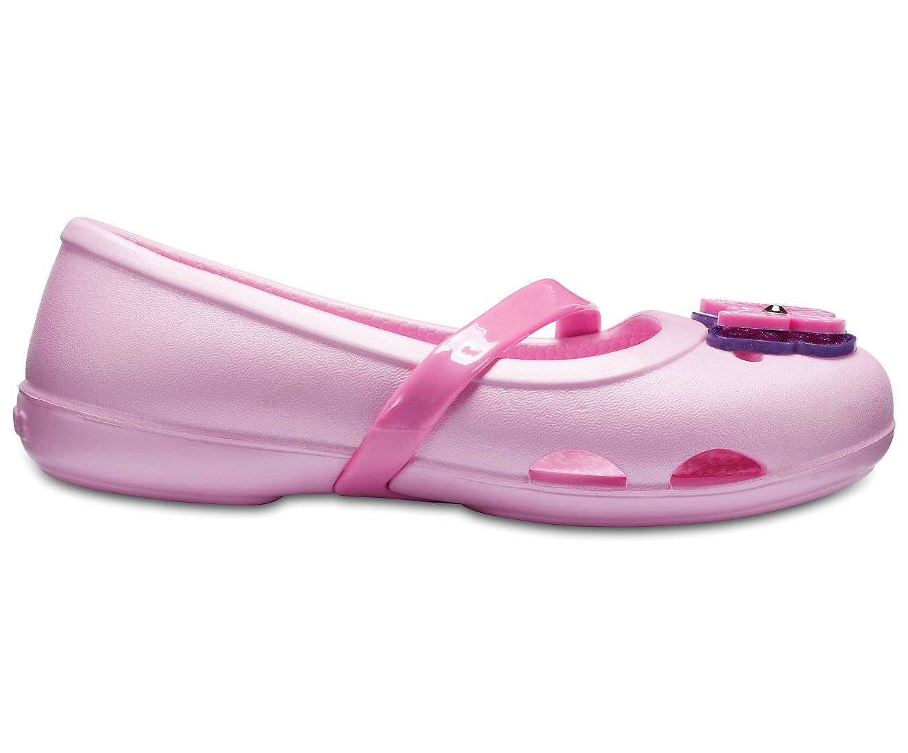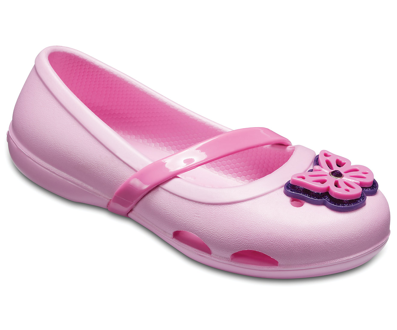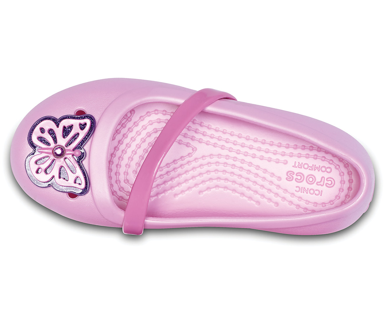 아이에게 그래픽의 영감을 담은 봄 시즌 플랫에서 하트, 나비, 꽃 중 하나를 선택하게 하세요. 전체의 Croslite™ 구조를 통해서 예쁜 모습을 편안하게 유지할 수 있습니다. 부드럽고 유연한 크로스 스트랩은 그녀의 발을 단단히 고정시킵니다.