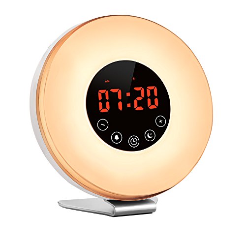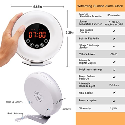 Alarm Clock,Witmoving Bedside Sunrise Simulator with Brightness Automatic Adjustment, 6 Nature Sounds ,FM Radio,Wake Up Light,Easy Set Up via Touch Control,Powered by USB Charger or Wall Jack