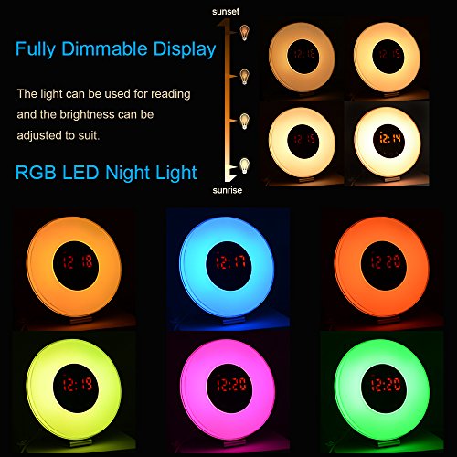 - 【Sunrise Simulation Wake Up】30 minutes before your alarm time, the wake up light brighten from 0% of brightness to 100% gradually and bring you out of a deep sleep gently. The natural sound or radio will be played for 2 minutes at the alarm time, bringing you a fresh morning